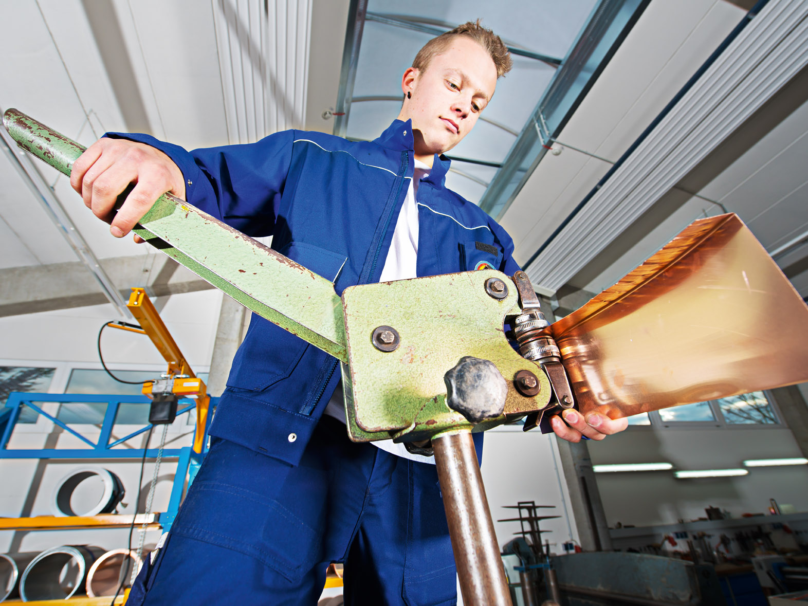 • Inhalte: Erlernen von Techniken wie Falzen, Biegen, Schneiden, Treiben, Löten und Schweißen von Metallen; Herstellung und Montage von Dachentwässerungssystemen, Gesimsen, Fensterbänken, Fassadenverkleidungen, Metalldächern; Installation von Blitzschutzanlagen.